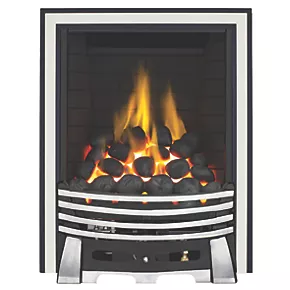 Antique chrome full depth radiant inset gas fire, with a chrome and black frame and front. Features a deep fuel bed for a dramatic and realistic flame effect and coal effect with decorative black ceramic tiles. Choose from high 3.75kW and low 1.9kW heat settings with the discreet rotary control. Provides a powerful source of heat and a stunning focal point.